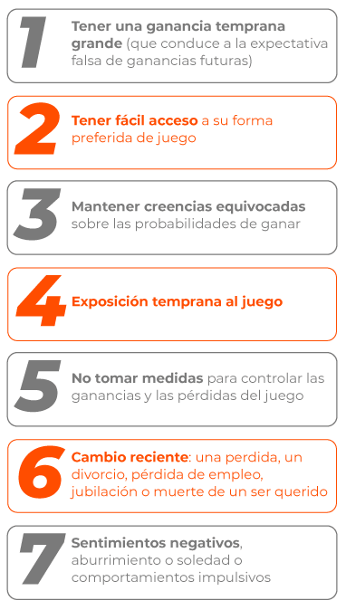 El contacto o la participación precoces en juegos de azar y apuestas (sobre todo cuando una persona muy joven consigue un premio temprano), una personalidad impulsiva o poco dada al autocontrol, jugar más de lo pensado inicialmente (especialmente con el fin de recuperar pérdidas) o no respetar el gasto máximo que se había decidido previamente, por ejemplo, son algunos de estos factores.