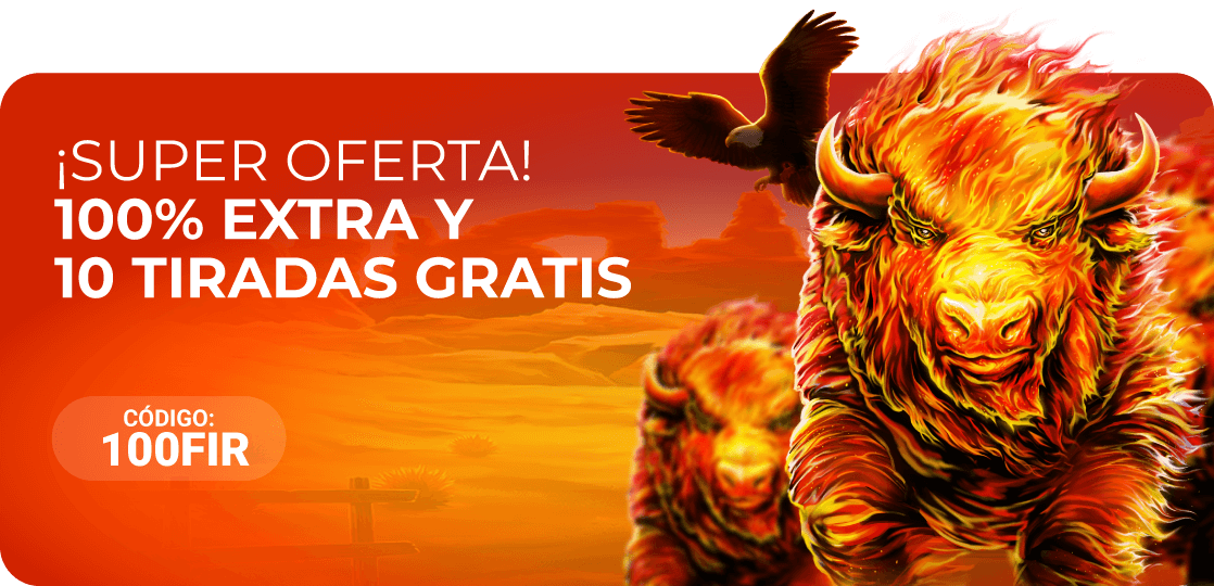 Empieza este miércoles con los mejores extras: Haz un depósito de 10€ o más con el código 100FIR y recibe un 100% EXTRA en el mismo, ¡podrás conseguir hasta 75€ en Bono Casino! Y además, 10 Tiradas Gratis en la slot Fire Stampede.