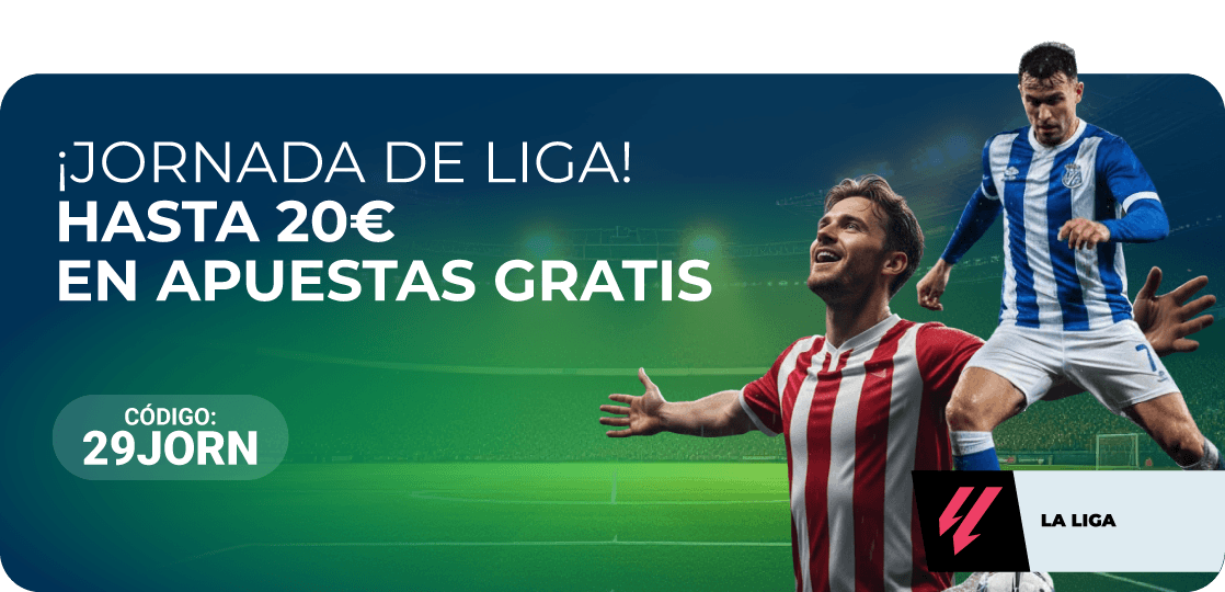 Para participar en esta promoción y recibir una Apuesta Gratis de 10€, el usuario tendrá que haber hecho un depósito de 20€ o más con el código 29JORN y realizar una apuesta en cualquier evento de La Liga con una cuota mínima de 2.00 o superior.