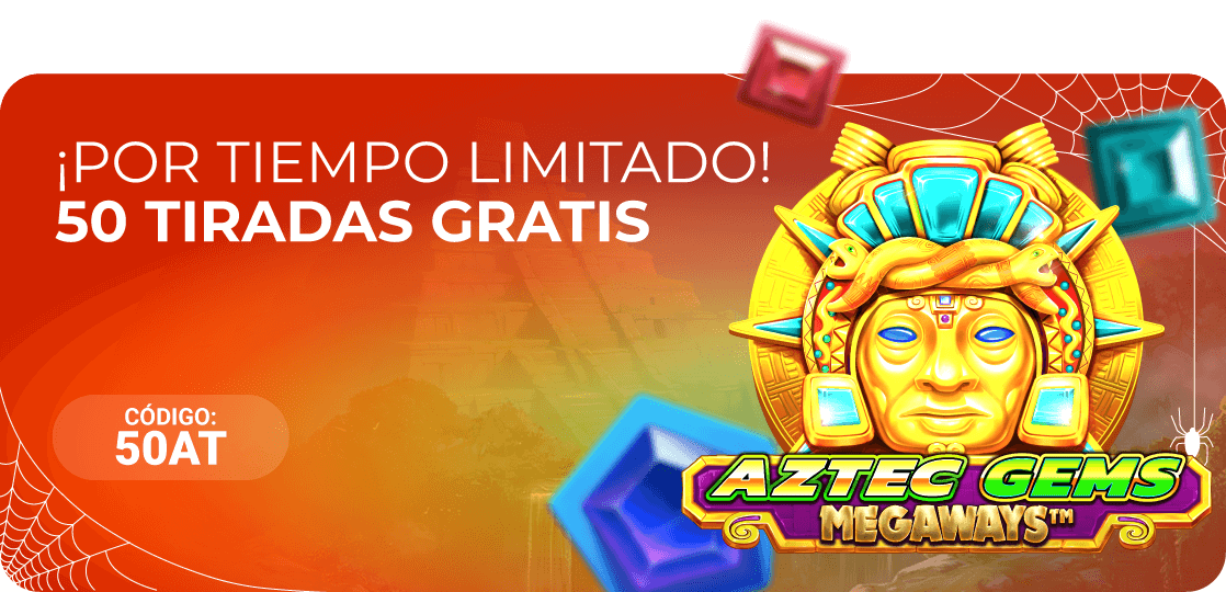 Haz un depósito de 10€ o más con el código 50AT y ¡listo! recibirás al instante 50 Tiradas Gratis para disfrutar en la slot Aztec Gems Megaways.