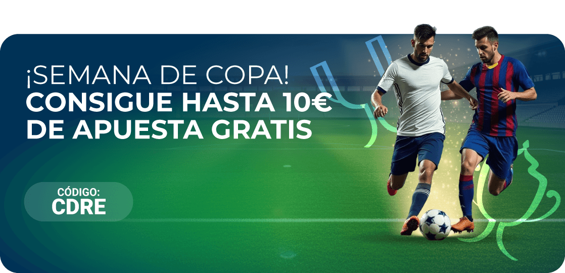 Para participar en esta promoción y recibir una Apuesta Gratis de 5€, el usuario tendrá que haber hecho un depósito de 15€ o más con el código CDRE y realizar una apuesta en cualquier evento de la Copa del Rey y la Copa de la Reina con una cuota mínima de 2.00 o superior.