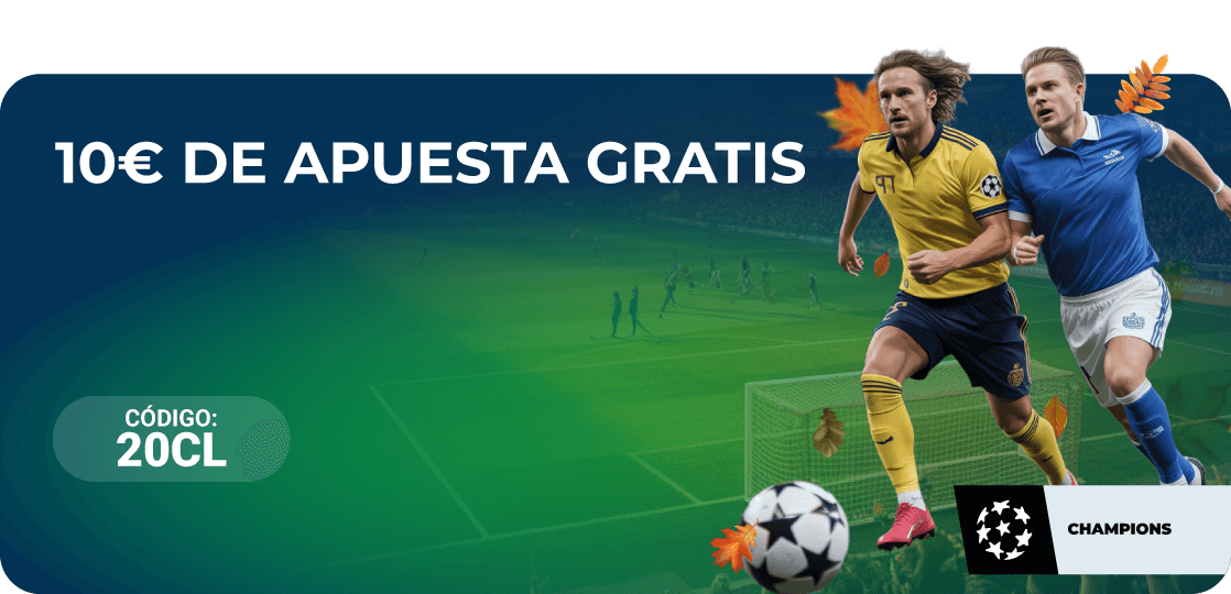 Para participar en esta promoción y recibir una Apuesta Gratis de 10€, el usuario tendrá que haber hecho un depósito de 20€ o más con el código 20CL y realizar una apuesta en cualquier evento de la Champions League con una cuota mínima de 2.00 o superior.
