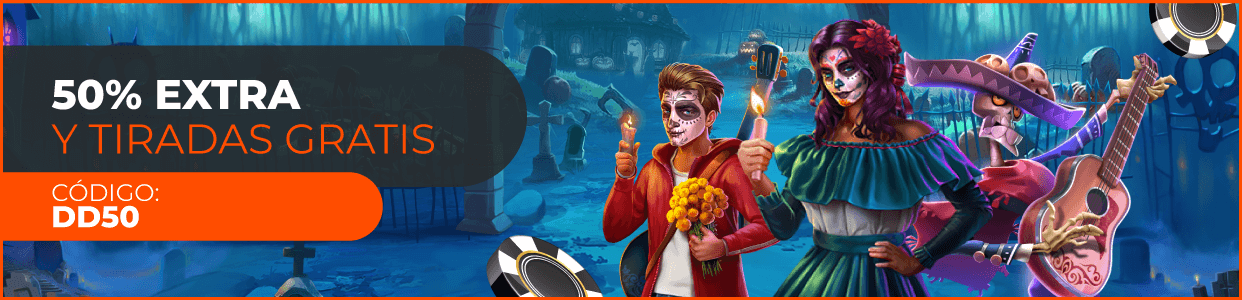 El usuario que realice un depósito de 25€ o más usando el código DD50 conseguirá un 50% extra, hasta 40€ en Bono Casino. Además de 1 minuto de Tiradas Gratis, con valor mínimo, en la slot Day of Dead.