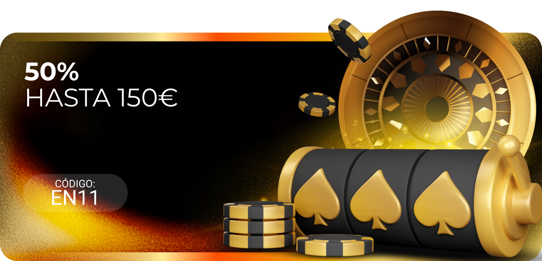 Haz un depósito de 20€ o más con el código EN11 y recibe un 50% EXTRA en el mismo, ¡podrás conseguir hasta 150€ en Bono Casino!