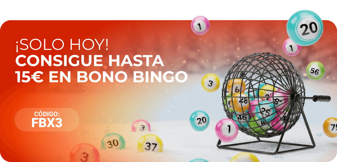SOLO HOY: Haz un depósito de 15€ o más con el código FBX3 y ¡listo! Recibirás al instante 5€ de Bono Bingo. Pero espera, que eso no es todo, ¡podrás utilizar el código tres veces y conseguir hasta 15€ en Bono Bingo!