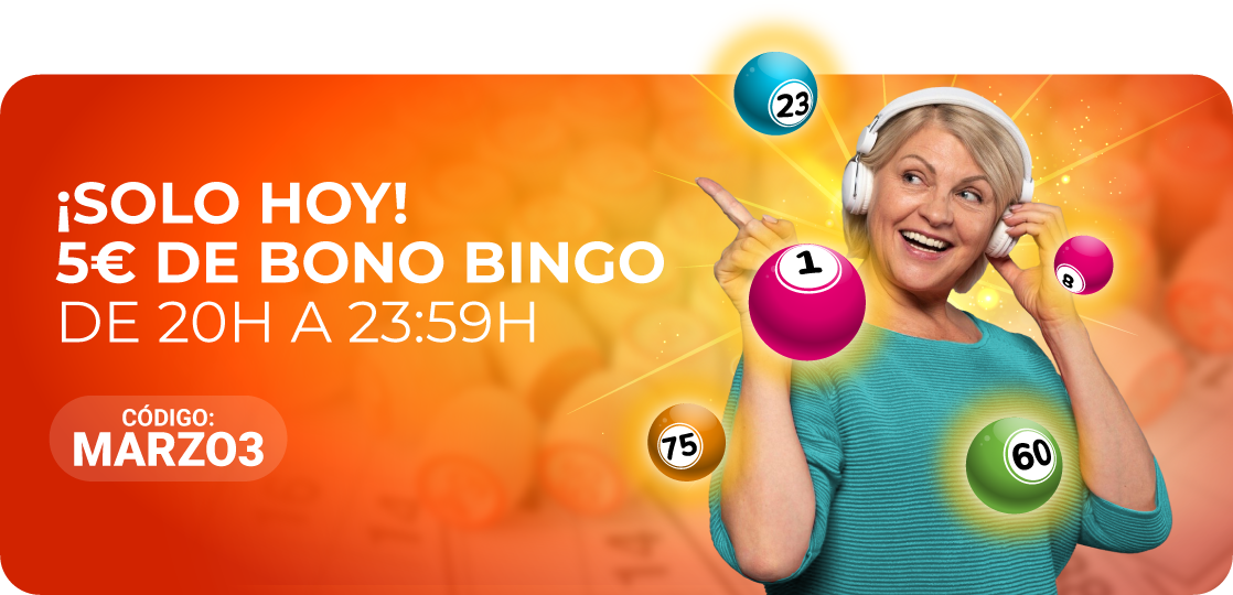 SÓLO HOY: Haz un depósito de 10€ con el código MARZO3 y recibirás 5€ en bono bingo para disfrutar en tus salas favoritas, ¿qué te parece?