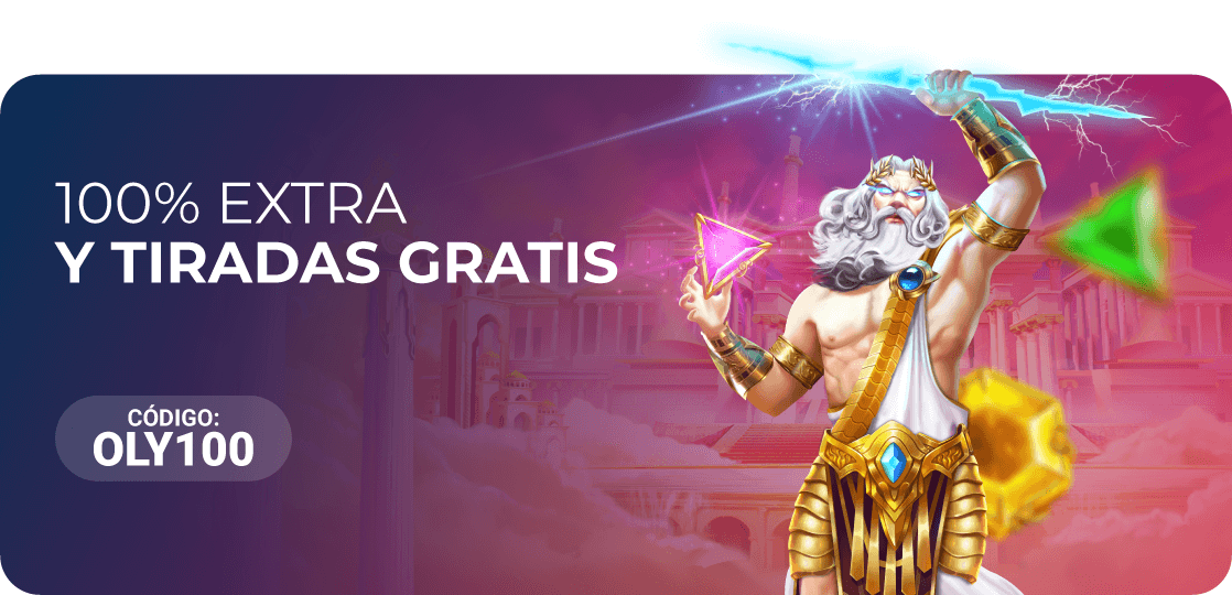 El usuario que realice un depósito de 20€ o más usando el código OLY100 conseguirá un 100% extra, hasta 45€ en Bono Casino y 30 Tiradas Gratis en la slot Gates of Olympus 1000.