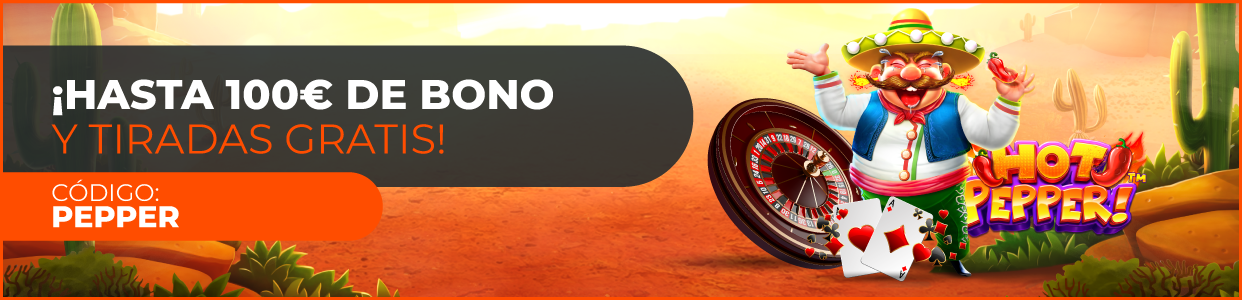 El usuario que realice un depósito de 30€ o más usando el código PEPPER conseguirá un 50% extra, hasta 100€ en Bono Casino. Además de 1 minuto de Tiradas Gratis en la slot Hot Pepper.
