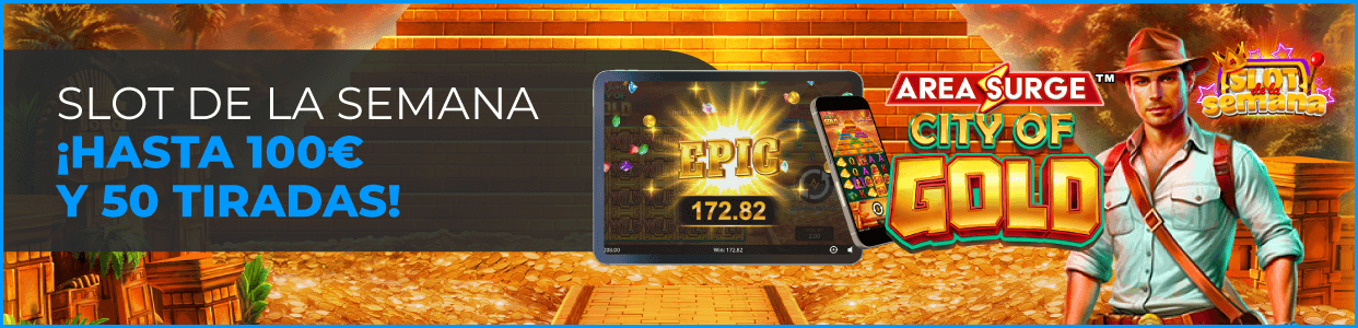 - La promoción Slot de la Semana: Area Surge™ City of Gold tendrá lugar desde el 7 de agosto al 13 de agosto de 2024 a las 23:59, hora peninsular española.